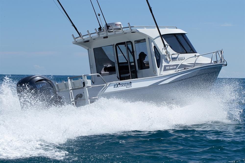 915 Game King The ultimate offshore fishing boat that performs as well as it looks stunning! Brochure Make an Enquiry Configure my Boat Boats in Stock 26' Length (7.95m) 9' Beam (2.8m) 6393lbs Tow Weight (2900kg) Max Passengers 8 400 HP Max HP Specifications Overall length 9.15MTR Beam 2.82MTR Transom and hull thickness 6mm Side and deck thickness 4mm Deadrise 20 degrees Recommended 300-450HP engine Overall length on trailer 10.80MTR Height on trailer 3.20MTR (including rod holders) Width on trailer 2.82MTR Standard towing weight 3450KG (approx) including engine and trailer Rated for 8 people Marine grade aluminium Standard Features 450 Ltr fuel tank including sender unit (maximum capacity) Aluminium bow sprit Aluminium moulded bump rail Aluminium rod holders Bait tank with window Battery switch (two way) Bilge pump with bilge grate Boarding ladder Bonnet access hatch Dash to house screen up to 16 inch Extreme graphics Flooding keel Fuel filter Full cabin squab set Fully welded underfloor construction Hatch covers Hydraulic steering kit Large Bouyancy Chambers Lined cabin Navigation lights Passenger handrail Portifino transom Radar mount Rod holders mid gunnels Self draining anchor locker Sliding windows in hardtop Trailer tie down lugs Transducer bracket Transom storage compartments (inc hatch covers) Treadplate flooring Trim tabs VHF Walkthrough transom with drop in door Wiring loom with 3 x 4 way switch panel Return to Game King